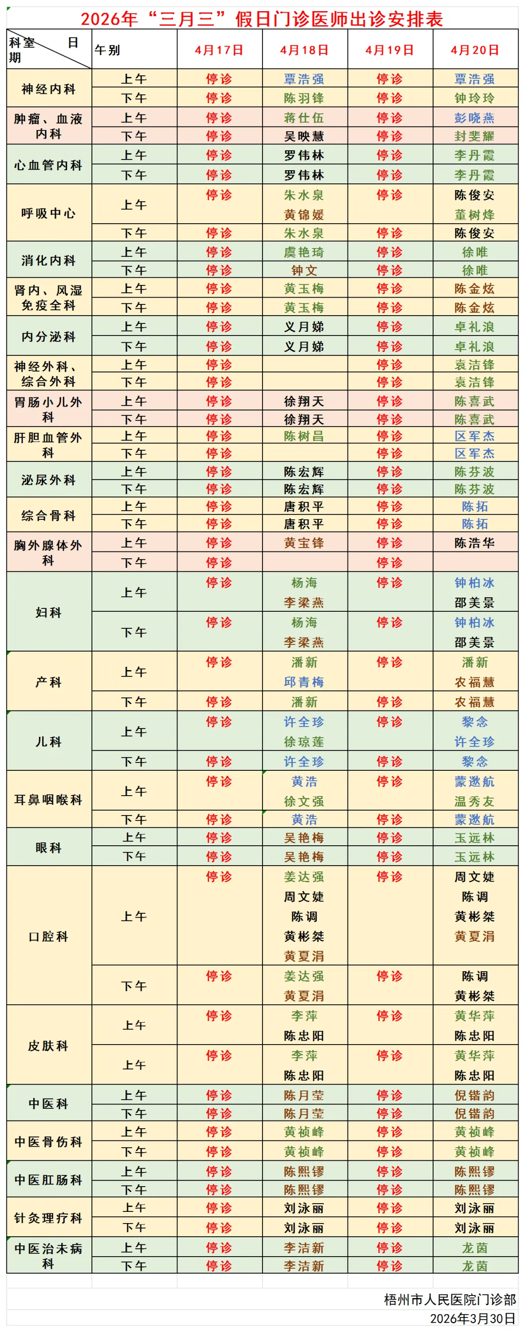 1.此表仅供参考。以当日门诊医师出诊情况为准,咨询电话:0774—3831120/2822120